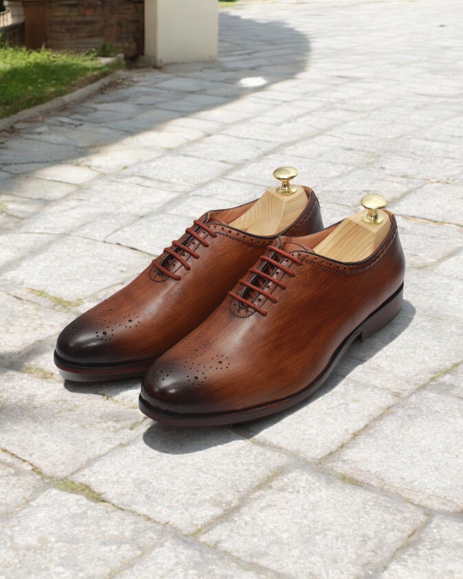 Crafted in Silence. Worn in Command — Baron Oak – Patina Cowhide Leather Wholecut Oxford is an expression of balance: between structure and warmth, legacy and ease. Sculpted from a single piece of fine cowhide and hand-finished in a rich oak patina with subtle toe burnishing, this shoe belongs to the gentleman whose elegance is effortless. A symbol of classic craftsmanship elevated through modern finesse.