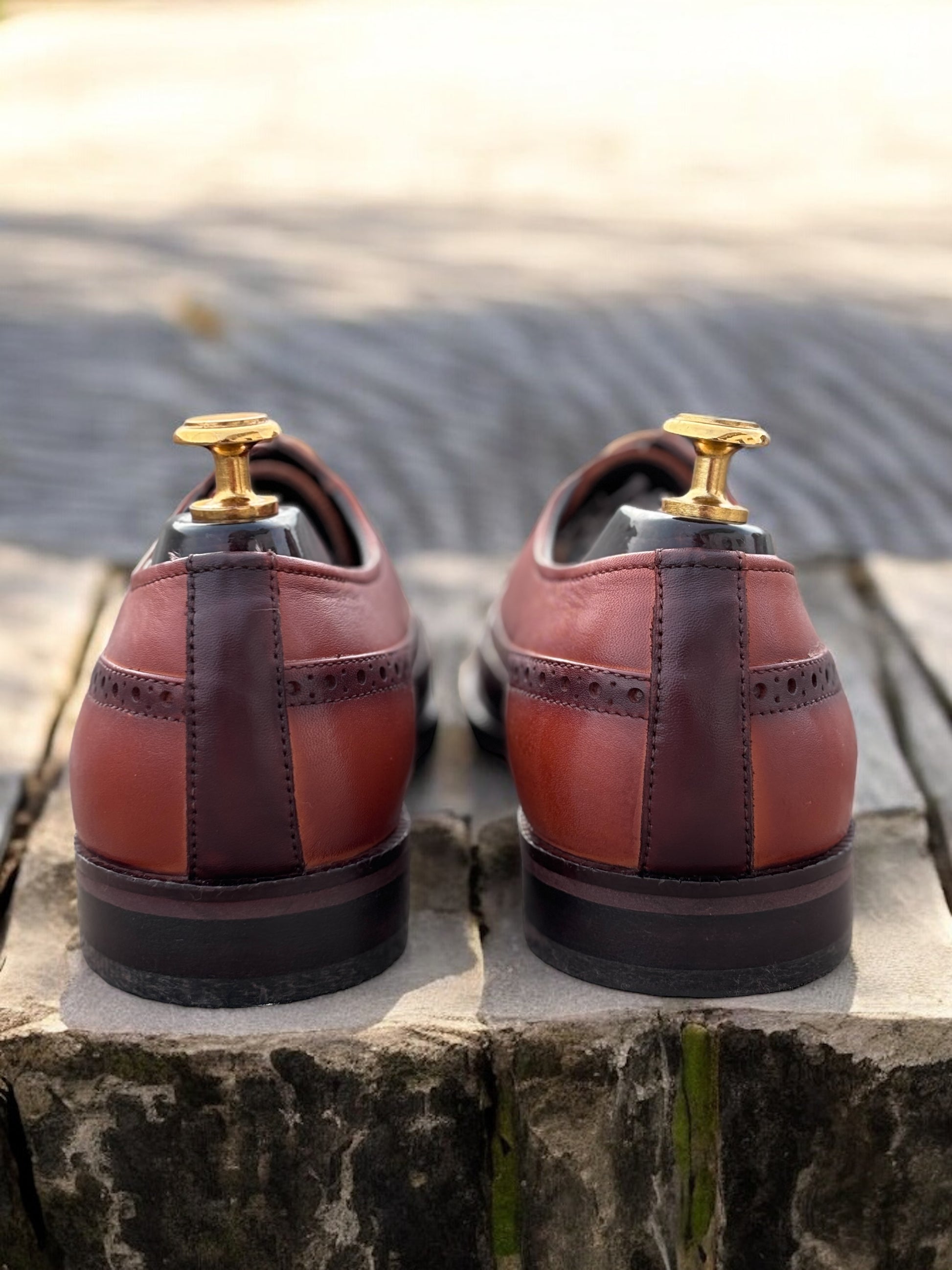 Rooted in refinement, elevated through detail — Chestnut Regent – Two-Tone Wingtip Leather Oxford is a sophisticated expression of contrast and craftsmanship. With its rich blend of chestnut and deep oxblood tones, paired with classic broguing and a commanding wingtip silhouette, this pair is designed for gentlemen who appreciate tradition, yet lead with distinction.