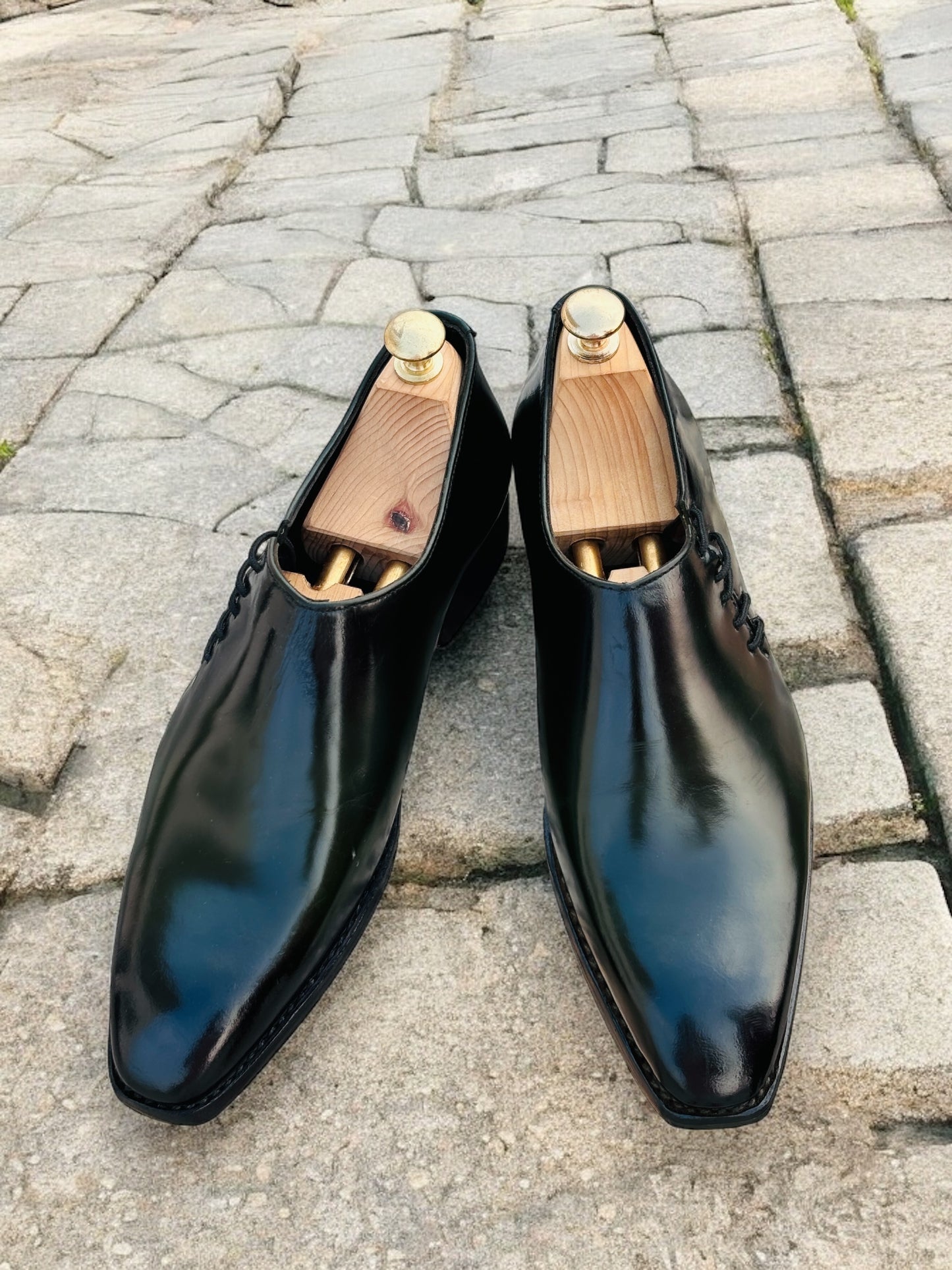 The upper is crafted from premium gloss-finished leather, polished by hand to achieve a rich, reflective surface.