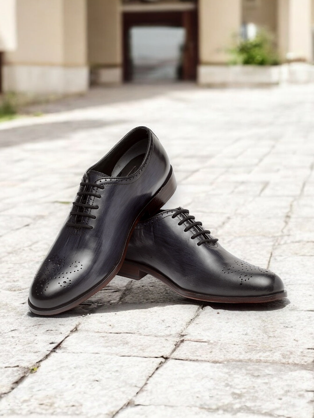A Mark of Understated Command — Noir Crest – Perforated Cowhide Leather Wholecut Oxford is crafted from a single uninterrupted piece of leather, lending it both elegance and structural purity. The soft perforated medallion at the toe adds a touch of refinement without distraction, making it the ideal companion for black-tie affairs, formal councils, and dignified evenings. It is not meant to impress loudly — but to stand immovably.