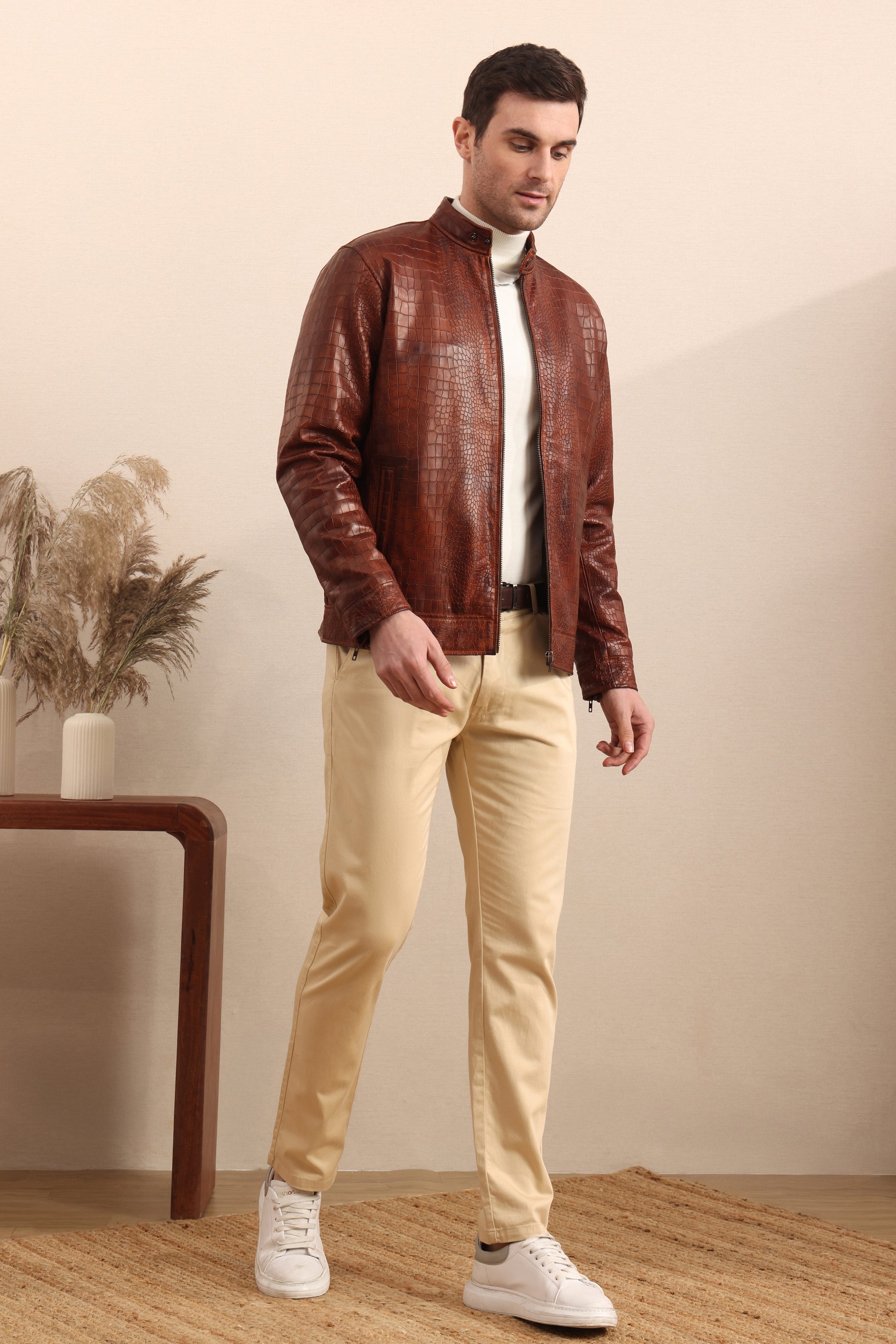 A Mark of Authority — Sovereign Scale – Crocodile Embossed Leather Jacket captures the primal strength of reptilian texture and refines it through noble tailoring. Embossed with a lifelike crocodile pattern, the jacket is sculpted for structure and statement. It’s a piece that speaks softly, yet leaves no room for doubt — the embodiment of control, discipline, and distinguished command.